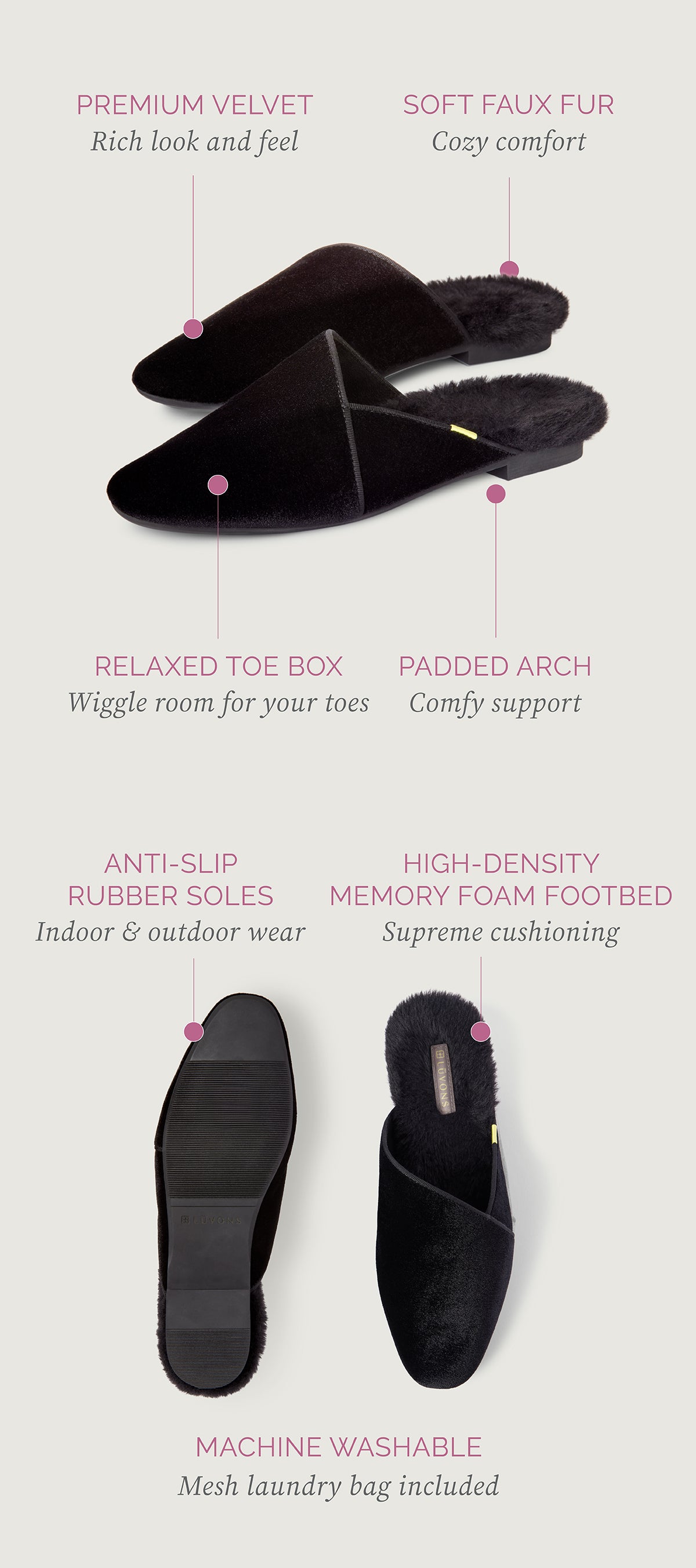 Black, Slate Blue, and Camel: Premium velvet upper and soft faux-fur lining.